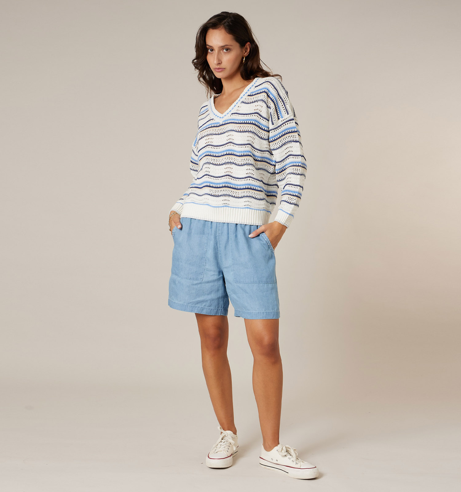 Deze Deeluxe Original trui met strepenprint is de perfecte aanvulling voor jouw kleerkast. Style deze zachte trui met jouw favoriete jeansbroek of jeansshort voor een stijlvolle, French-chic look. Deze blauwe trui staat ook mooi op een geklede(re) broek, wijde broek of chino, al raden wij wel aan om broeken met een (drukke) print te vermijden. Deze Deeluxe Original trui komt het best tot zijn recht in combinatie met monochrome onderstukken. Laat deze blauwe trui met print de eyecatcher zijn!