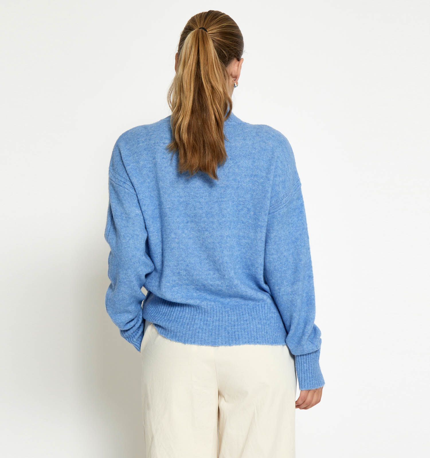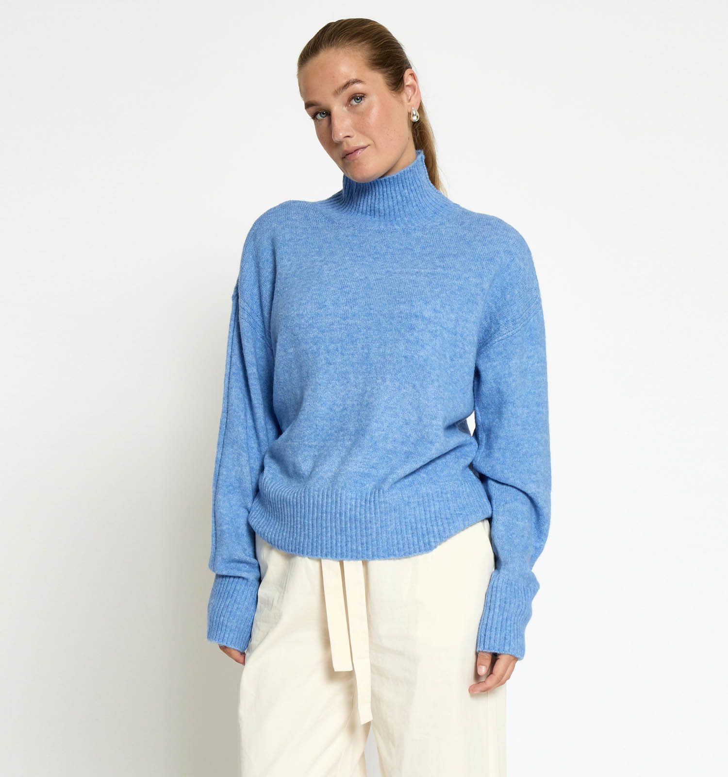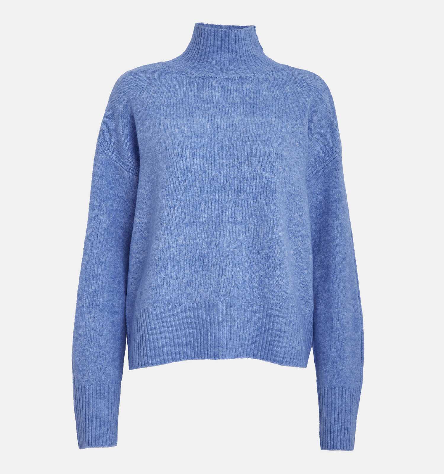 Deze damestrui in de kleur blauw heeft een turtleneck en lange mouwen.