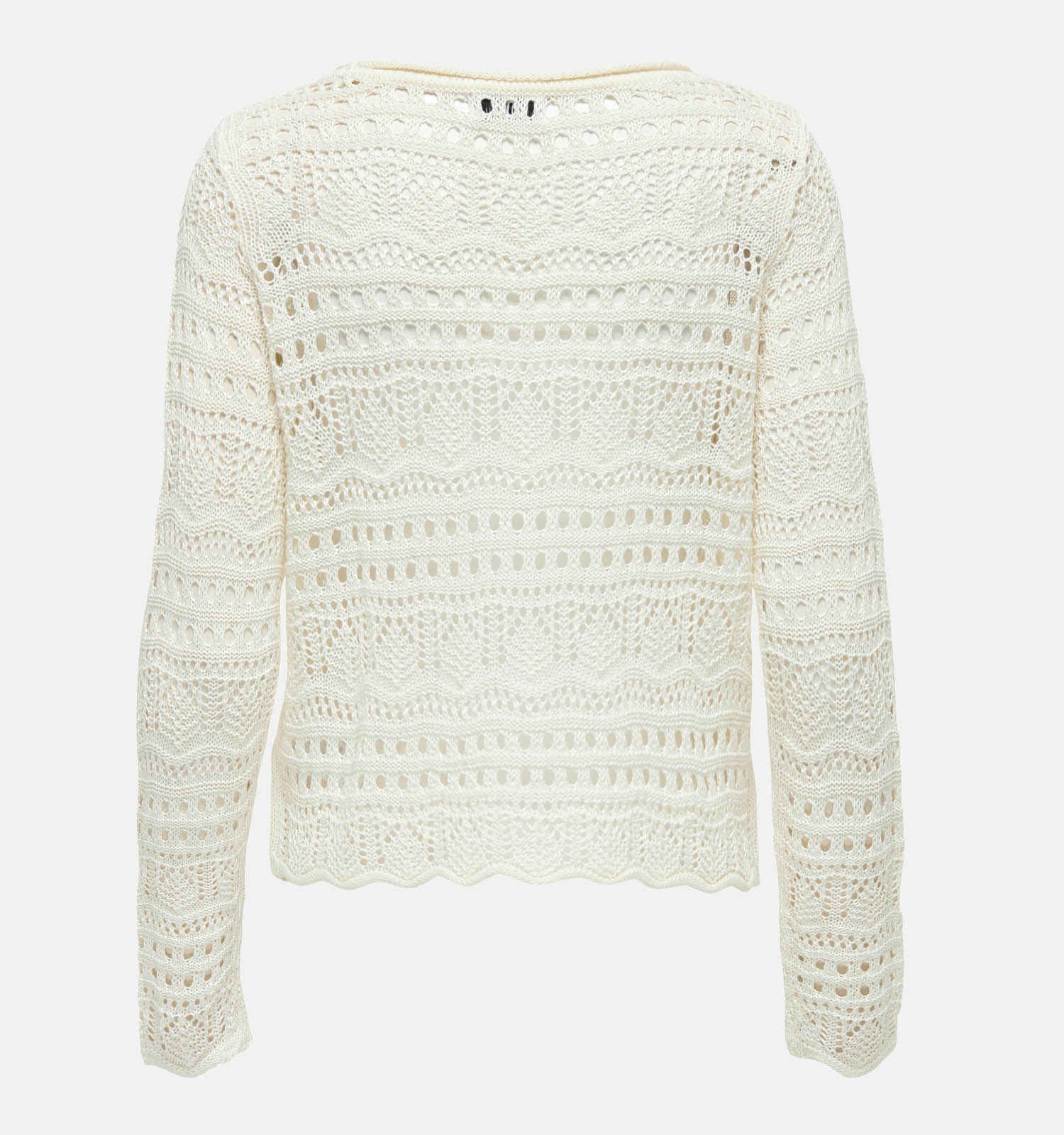 Deze damestrui in de kleur wit heeft een ronde hals en lange mouwen.