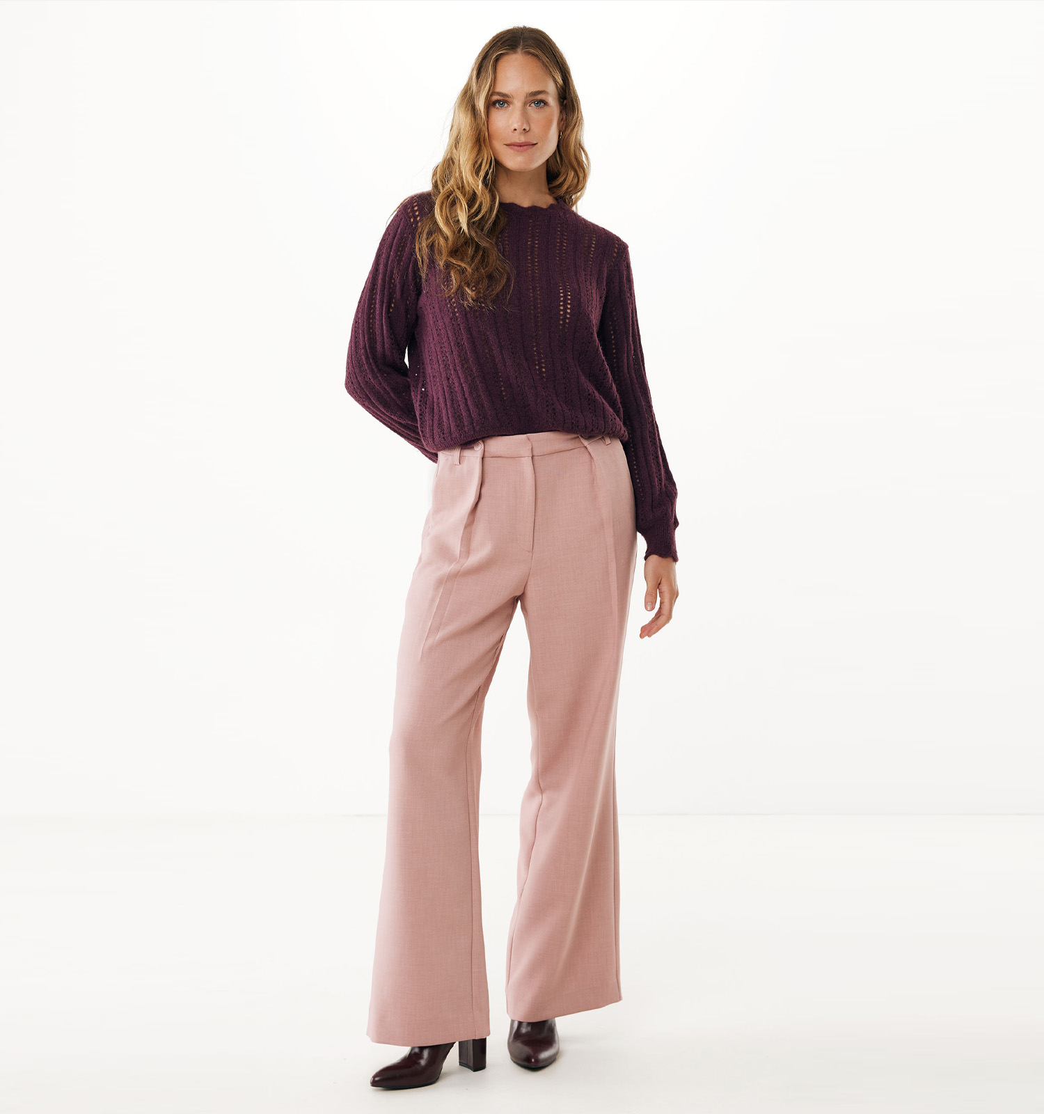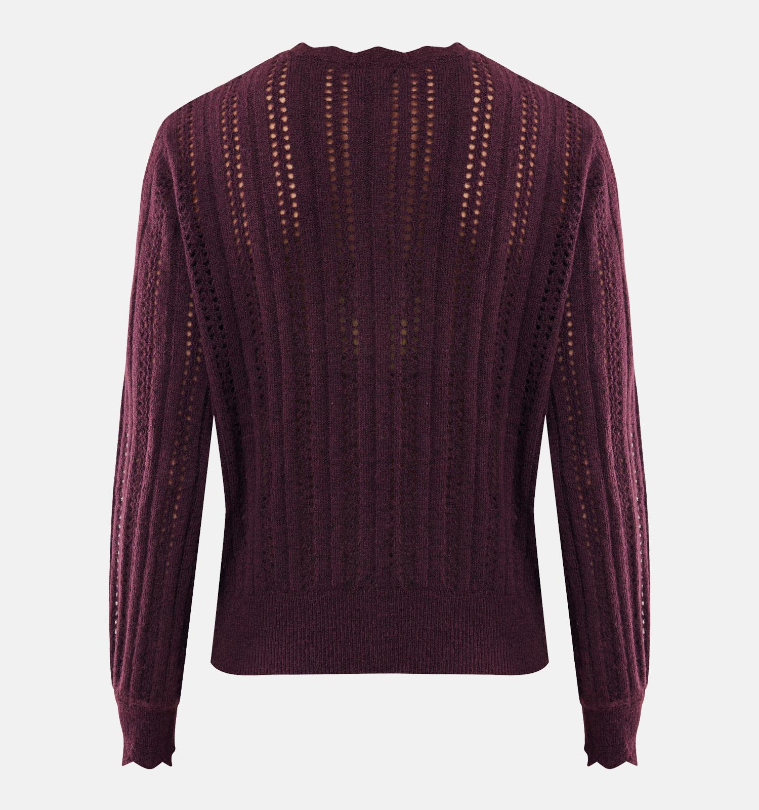 Deze damestrui in de kleur bordeaux heeft een ronde hals en lange mouwen.
