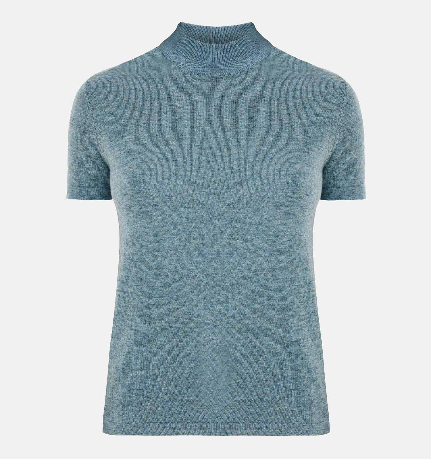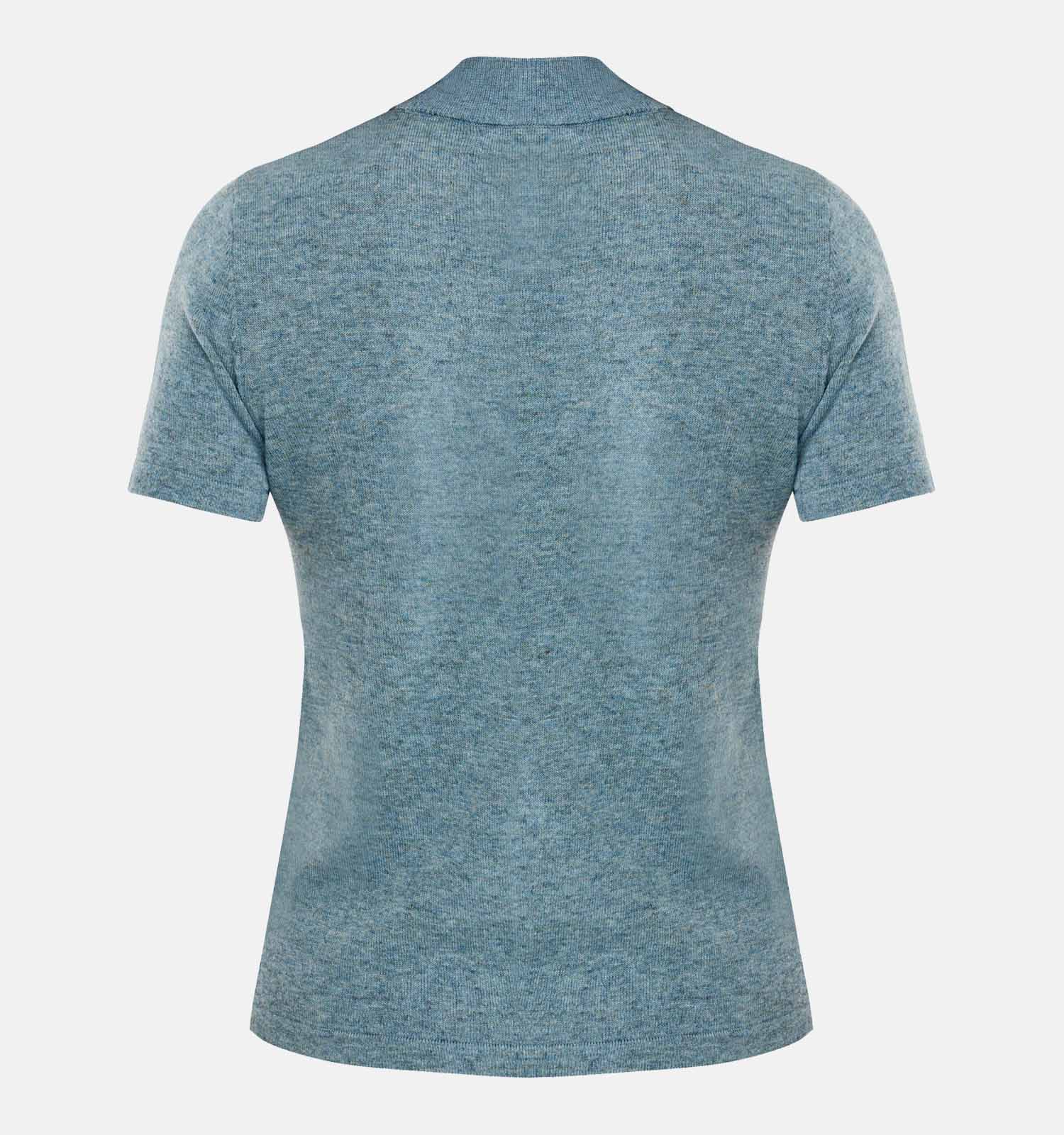 Deze damestrui in de kleur blauw heeft een opstaande kraag en korte mouwen.
