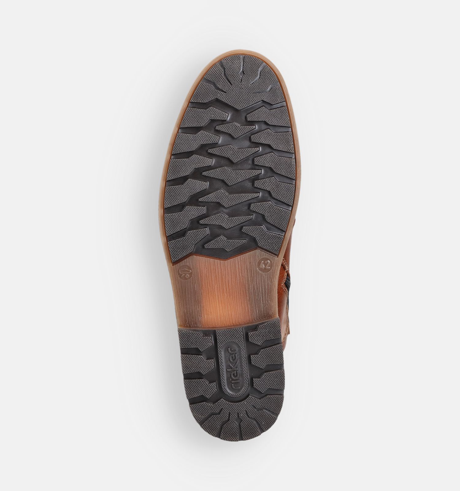 Comfortmerk Rieker maakt anti-stress herenschoenen die de wandelimpact op jouw lichaam sterk vermindert en de hele dag door optimaal comfort geven. Dit komt o.a. door de schokdempende schoenenzolen van deze herenboots in de kleur cognac. Deze zolen absorberen de wandelschokken en verspreiden vervolgens de druk over de hele zool heen. De pasvorm van deze cognac boots is ergonomisch en houdt rekening met het feit dat alle voeten licht opzwellen tegen het einde van de dag.