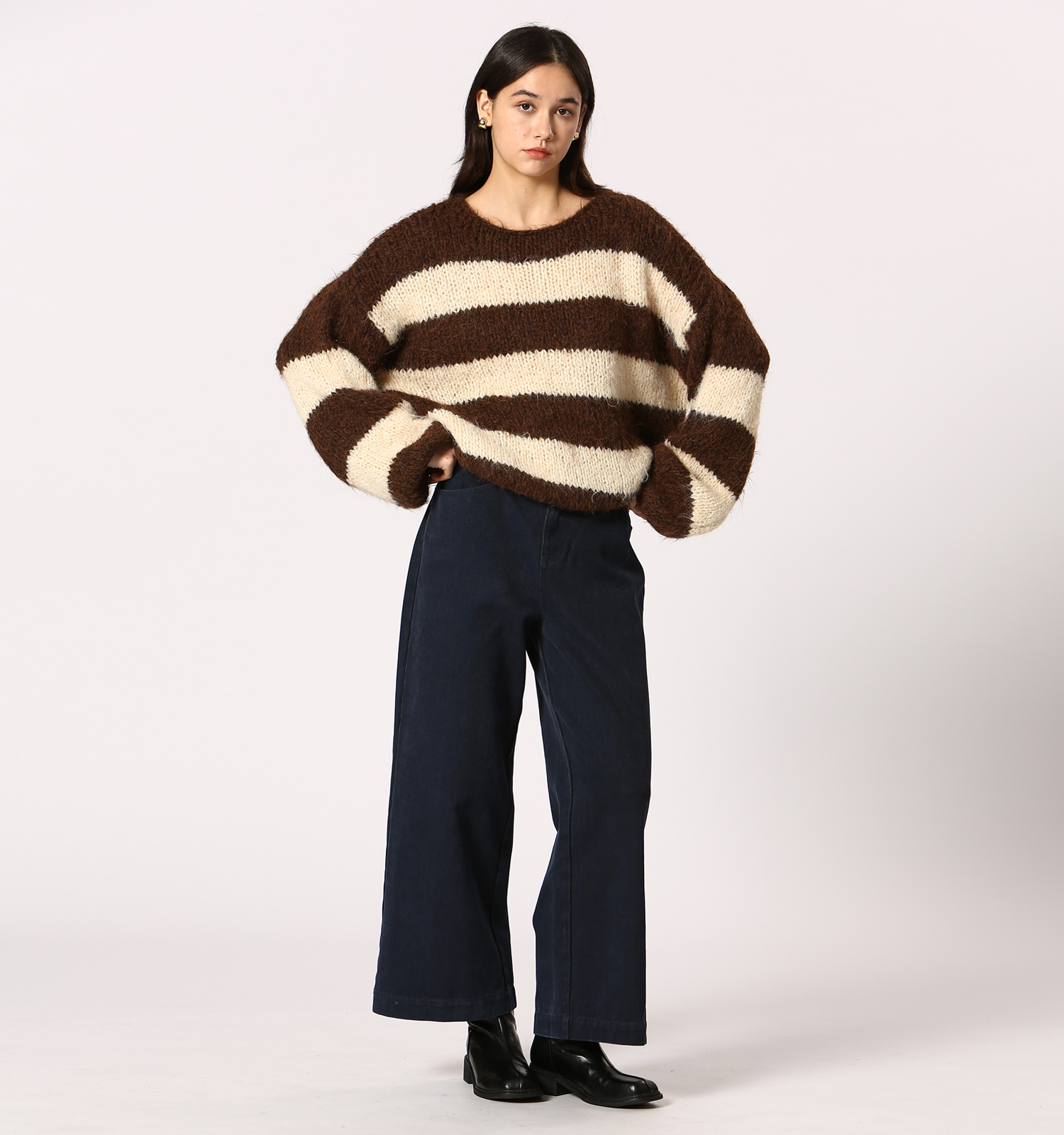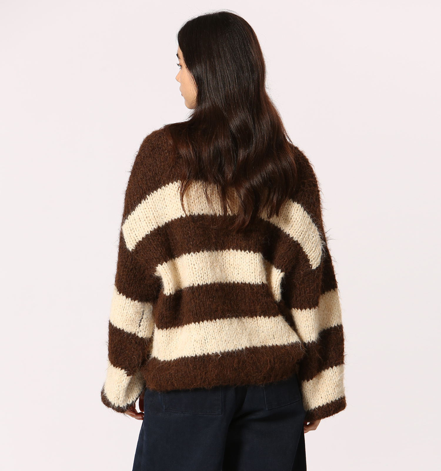 Deze comfortabele damestrui met strepenpatroon is vervaardigd uit kwalitatief elastaan, nylon, polyester, wol. Deze bruine trui van het topmerk The Korner scoort niet alleen een tien op tien op comfortvlak… Het is ook een tijdloos trendy model en dé kers op de taart van elke outfit!