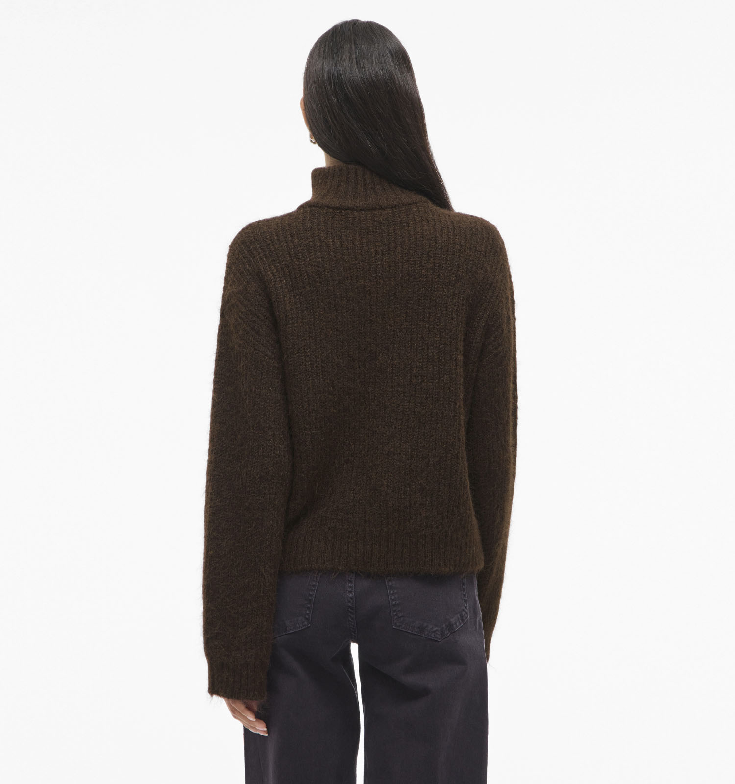 Deze damestrui in de kleur bruin heeft een opstaande kraag en lange mouwen.