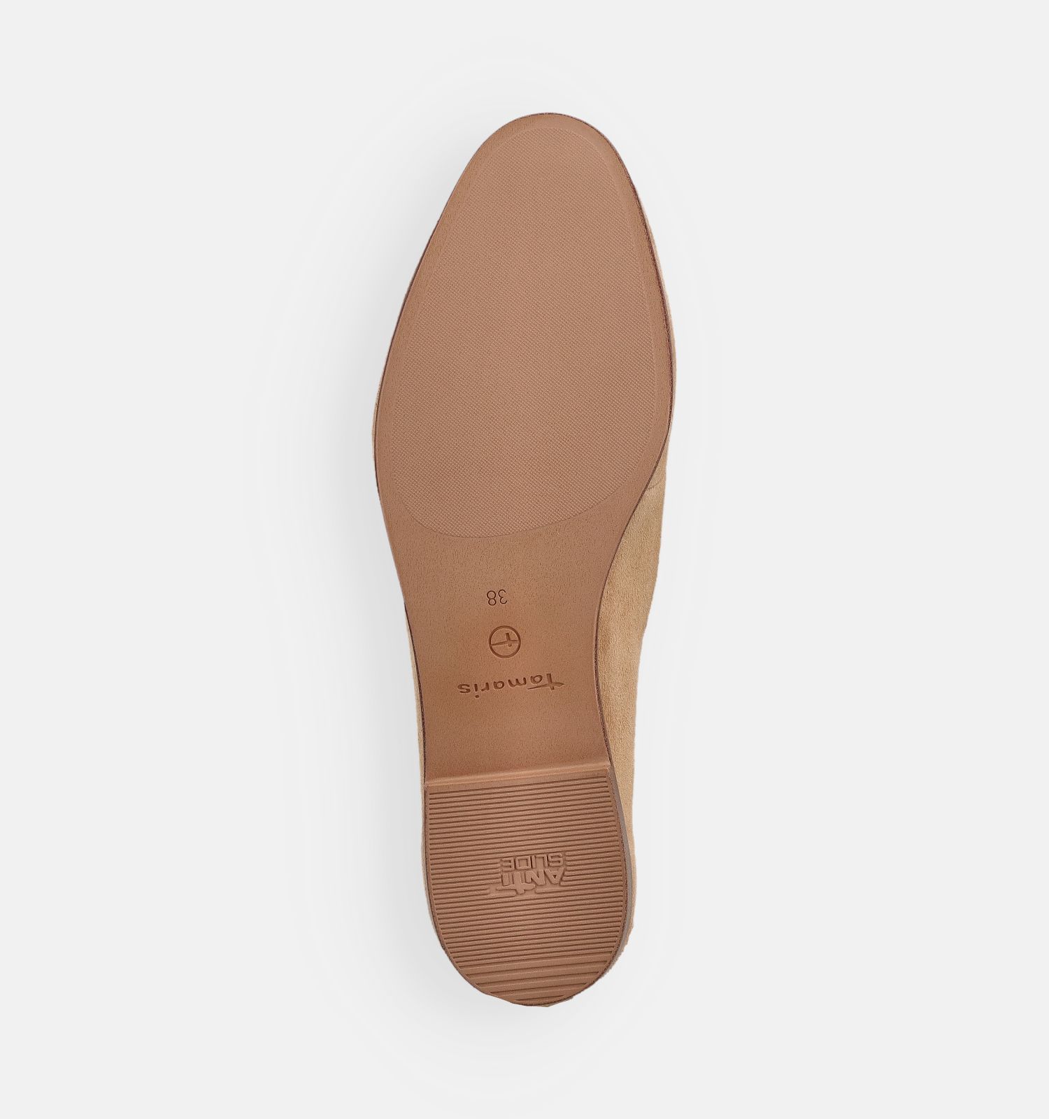 Deze Tamaris loafers uit beige suède hebben een elegant silhouet met op de wreef die twee kenmerkende inkepingen. Wist je dat dit een versmallend effect op de voetbreedte creëert? Het is een detail dat de loafer ook visueel lichter en moderner maakt, waardoor deze Tamaris instapper makkelijker te combineren valt met zowel jeans als gekledere stukken. Deze beige damesloafers van het merk Tamaris hebben ook een subtiele blokhak die je op een elegante manier wat extra hoogte geeft. Dit tilt de hiel licht op, wat je lichaam subtiel naar voren kantelt – resulterend in een rechtere rug en betere houding!
