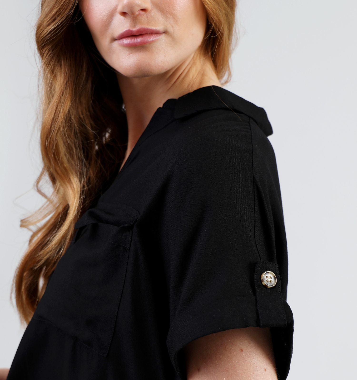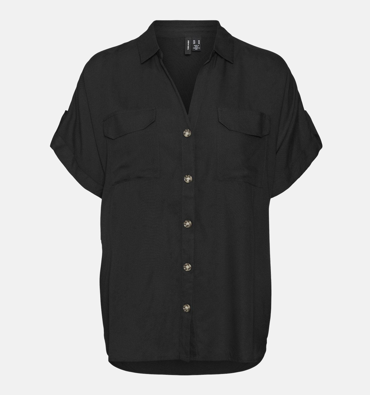 Een dameshemd is een leuk fashion item om in jouw kast te hebben! Een hemd zoals dit zwarte exemplaar van het merk Vero Moda is door de veelzijdigheid aan stylingopties een dankbaar kledingstuk. Je kan het klassiek dragen in formele(re) omgevingen. Laat je alle knopen van dit zwarte hemd open, dan kan je het gebruiken als vervanging voor een vest, bovenop een t-shirt of top. Je kan de onderste knopen onderaan dit Vero Moda dameshemd open laten en de twee kanten onderaan in een knoop of strik verwerken, als je bijvoorbeeld naar het strand gaat.
