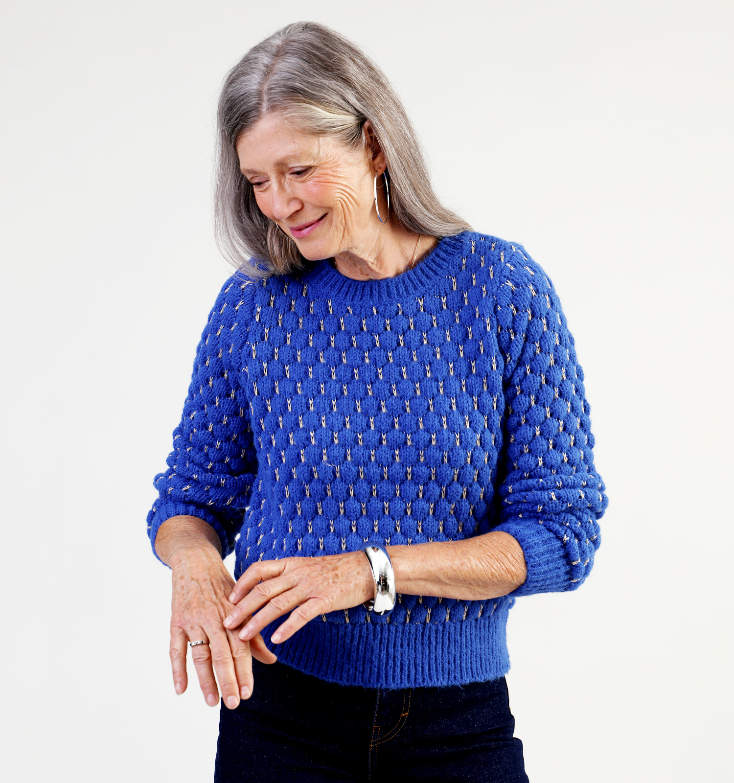 Deze damestrui in de kleur blauw heeft een ronde hals, en lange mouwen. De truilengte is 50 cm bij maat S.