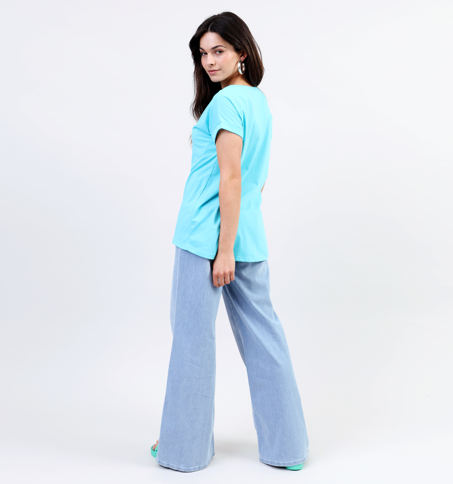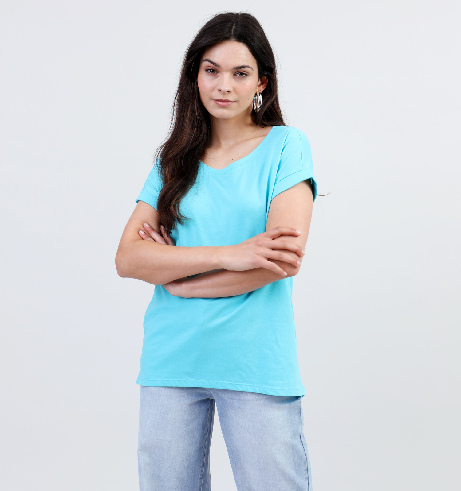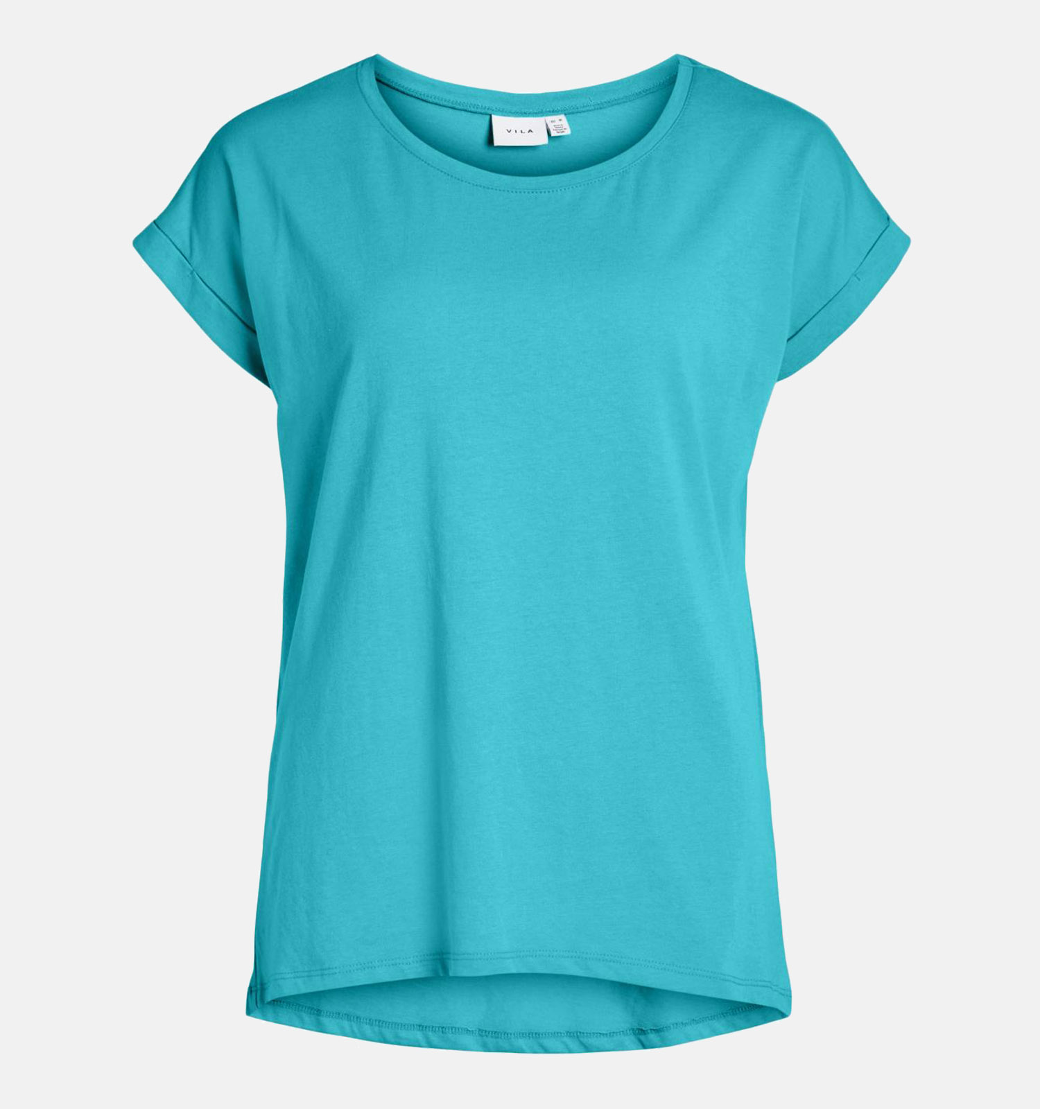 De vaste waarde in elke kleerkast is een collectie leuke t-shirts met korte mouwen. Deze turquoise dames t-shirt van Vila is een meerwaarde voor die collectie! Vila staat bekend voor op-en-top comfort en een uitstekende prijs/kwaliteitverhouding. Turquoise is daarnaast helemaal trendy nu, dus dit model scoort alles op alles op alle vlakken!